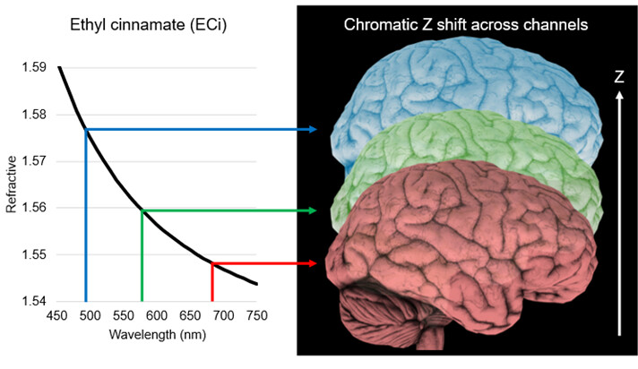 Chromatic dispersion describes the phenomenon where a material’s refractive index varies with wavelength. When a mounting medium exhibits strong dispersion across the spectrum, fluorescence of different wavelengths propagates through the medium with slightly different optical paths. As a result, structures labeled with different fluorophores may be imaged at different depths even though they originate from the same physical location in the sample. This effect is noticeable when using hydrophobic mounting mediums like ethyl cinnamate (ECi). ECi is widely used because its refractive index closely matches that of cleared tissue, providing excellent transparency and deep tissue imaging capability. However, ECi exhibits strong chromatic dispersion, which can introduce noticeable focal shifts between fluorescent channels across the visible spectrum.